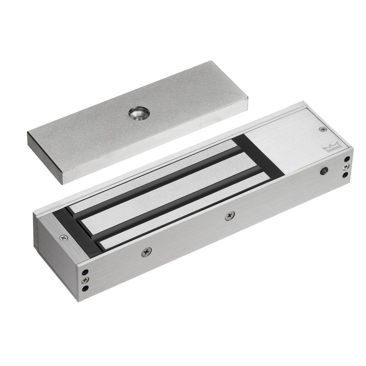 Сила удержания 530кг. Корпус из анодированного алюминия. Магнит из высокоочищенной меди. Встроенный датчик состояния двери и состояния замка. Электронная защита от перепадов напряжения. 12/24В DC, 500мА/250мА, от –40 °C до +50 °C, 268 x 73 x 40 мм, Вес 5кг.