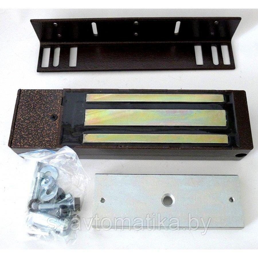 Сила удержания 500 кг, с датчиком Холла, 12 В, 0,65 A, IP67, -40…+50 °С, 270x75x45 мм, 5600 г., механический компенсатор эффекта остаточной намагниченности на якоре замка. Уголок в комплекте. Цвет коричневый.