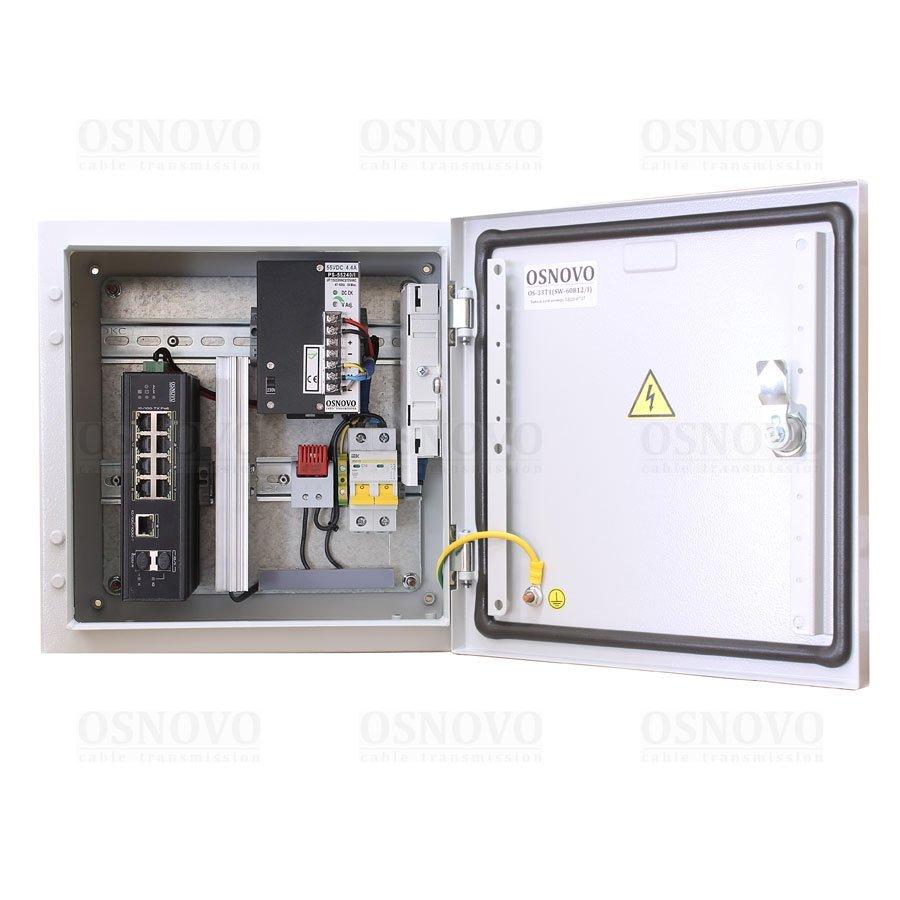 Коммутатор неуправляемый 11 портовый c термостабилизацией; 6хRJ-45 POE 10/100 Base-T, Метод A (IEEE 802.3af/at) до 30Вт, 2хRJ-45 POE 10/100 Base-T, Метод A+В (IEEE 802.3af/at) до 60Вт, бюджет POE 240Вт; 1хRJ-45 10/100/1000 Base-T; 2xSFP 10/100/1000 Base-T; AC 100-240В; встроенная грозозащита 6кВ; 300x300x210мм; IP66; -50...+50°С. В комплекте оптическая розетка, КДЗС (2шт), пигтейлы SM SC/UPC (2шт). Корпус из металла. Поддержка режима CCTV передачи данных и питания до 250м.