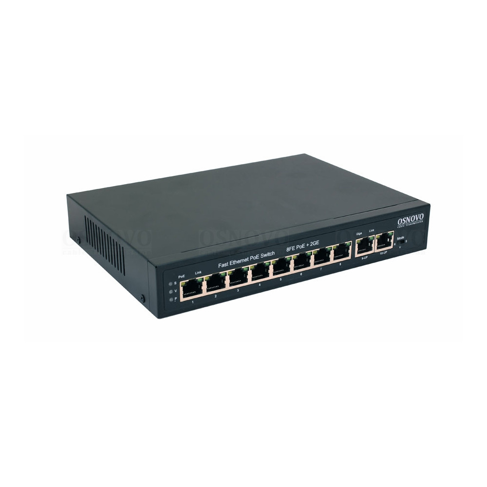 Коммутатор Gigabit Ethernet на 10 RJ45 портов. Порты: 8 x FE (10/100 Base-T) с поддержкой PoE (IEEE 802.3af/at), 2 x GE (10/100/1000 Base-T). Мощность PoE на порт - до 30Вт. Суммарная мощность PoE - до 120Вт. Увеличение расстояния передачи данных и питания до 250м. Встроенная грозозащита 6кВ. AC100-240В; 123 Вт; -10...+55°С; 210x35x150 мм.