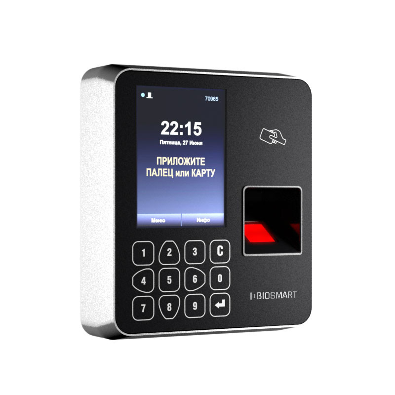 Биометрический терминал УРВ, количество отпечатков пальцев в локальном режиме - 4500, в серверном - 30000, количество карт - 5000, количество событий - 100 000. Встроенный считыватель карт Mifare, Интерфейсы: USB, Ethernet. Сенсорная клавиатура, 3,5" ЖК индикатор, управление исполнительными устройствами (замок, турникет). 12 В, 400 мА, PoE IEEE 802.3af, 0...+50°C, 142х123х41 мм