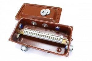 Клеммная коробка с муфтами МВ-М(РКн) (металлорукав-коробка); сечение жил до 4 кв.мм; Количество зажимов: 20 шт; Номинальный ток до 25A; Материал изготовления: оцинкованная сталь; Покрытие: грунтовое; Напряжение переменного тока: 660 В; Напряжение постоянного тока: 440 В; Климатическое исполнение: У 2; t-раб.-40…+60°С; IP54; Тип вводов: РКн; Параметры вводов: Муфта вводная МВ-М(РКн)-20 (3 шт.), Муфта вводная МВ-М(РКн)-25 (1 шт.), Заглушка метал. Ø25 (4шт) + Ø32 (1шт); размеры 175х358х100 мм