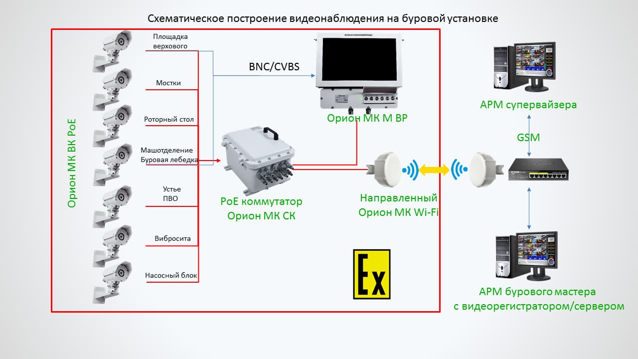 Радио мост Орион МК Wi-Fi позволяет передавать информацию с камер наблюдения на буровой в вагон бурового мастера. Также в кабине бурового мастера располагается основной видеорегистратор (сервер) на котором хранится архив сроком не менее 60 дней.