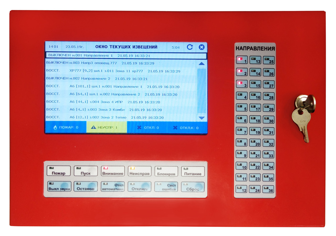 Органы управления и индикации ВПУ «Бирюза» расположены на лицевой панели и состоят из 7`` сенсорного LCD-дисплея, предназначенного для отображения извещений от компонентов АСПС и другой системной информации, а также ввода команд управления, 6-ти кнопок управления, 12 светодиодных индикаторов для отображения обобщенной информации о состоянии ППКПиУ и подключенных к прибору компонентов АСПС, 36 индивидуальных светодиодных индикаторов для отображения состояния и режимов работы до 36 направлений автоматики ППКПиУ, встроенного звукового сигнализатора.