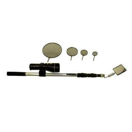 Комплект досмотровых зеркал (4 круглых: 140, 80, 50, 35 мм; 1 прямоугольное 110х65 мм) со светодиодным фонарем. Длина штанги: 680 - 1580 мм. Угол поворота зеркала до 180 градусов. Масса изделия: 0,95 кг. Электропитания: 2 батареи типа D. Водоотталкивающий чехол.