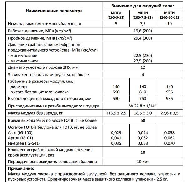 Модули МПТИ предназначены для длительного хранения под давлением и выпуска в защищаемое помещение газовых огнетушащих веществ при тушении пожаров класса А, В, С и электрооборудования, находящегося под напряжением. Напряжение, при котором можно тушить электрооборудование под напряжением, должно соответствовать требованиям нормативно технической документации на ГОТВ.